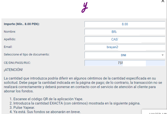 Este método también es uno de los más fáciles y rápidos de efectuar, lo puedes encontrar haciendo clic en hacer un depósito, luego ir al apartado que dice tarjetas bancarias y seleccionar YAPE.